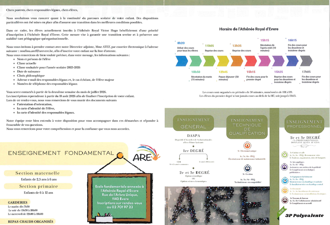 En vue de l’année scolaire 2026-2027, la période d’inscription pour les classes de première année commune débutera le lundi 2 février pour se terminer le vendredi 6 mars 2026 inclus. Pour l'inscription se munir du "Formulaire Unique d'Inscription" (F.U.I.) délivré par l'école primaire.